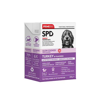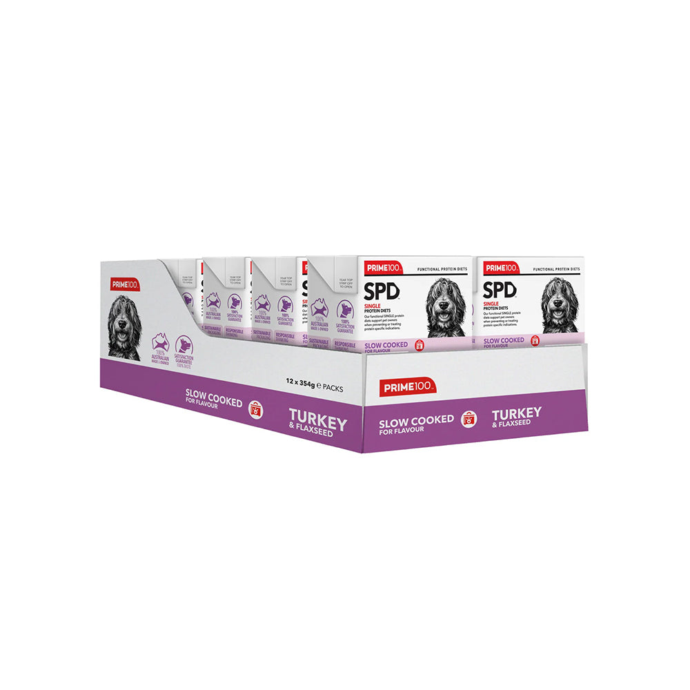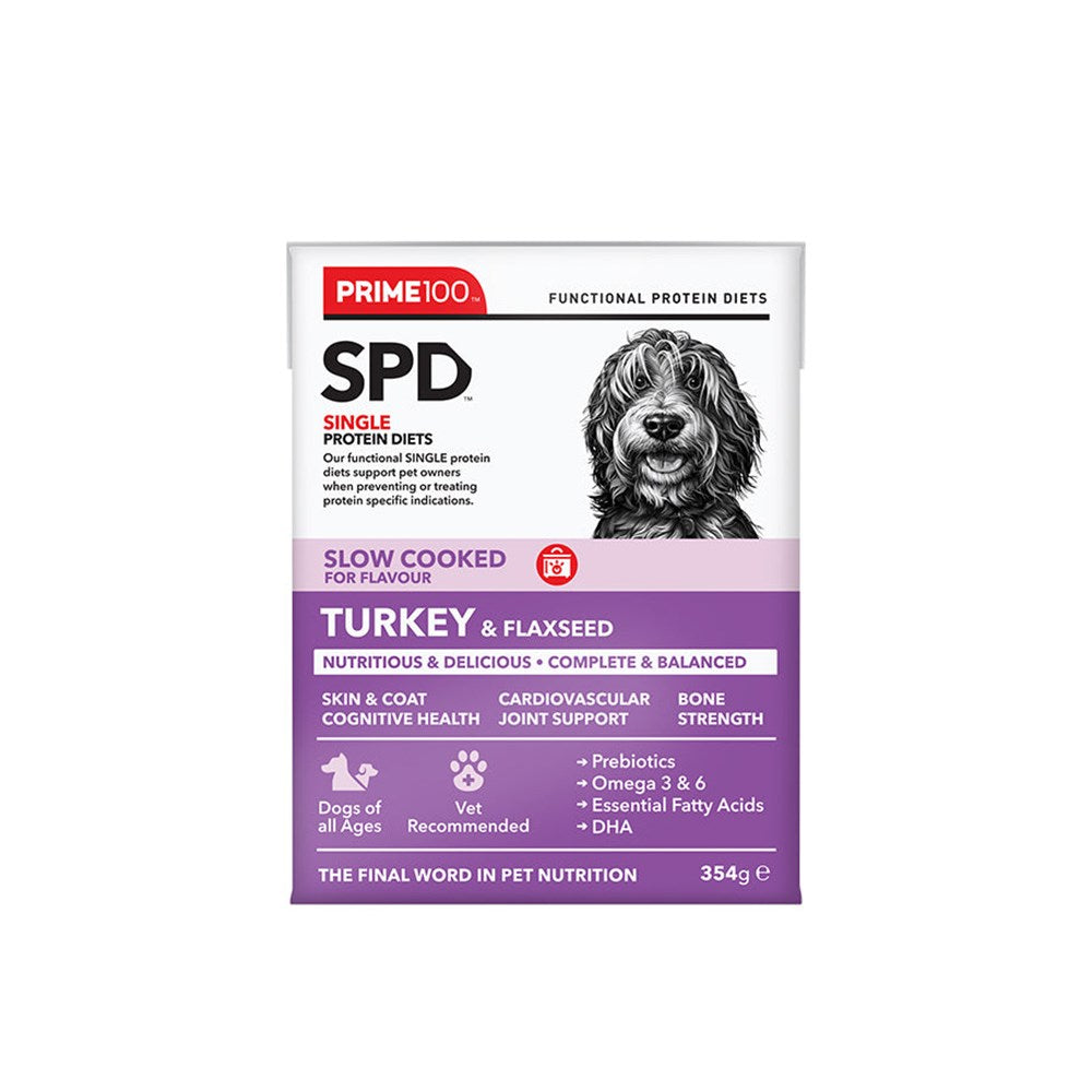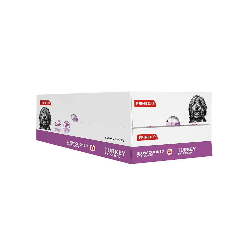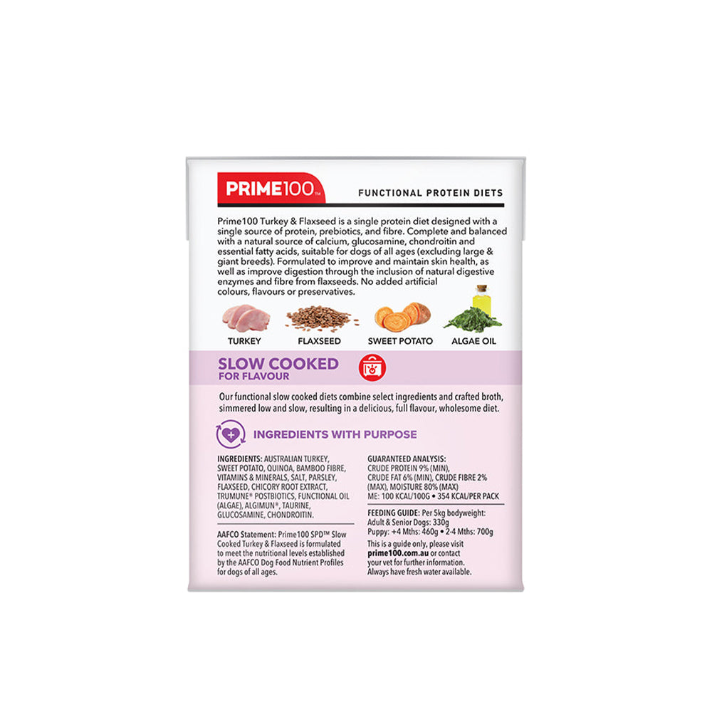 Prime100 Turkey & Flaxseed is a single protein diet designed with a single source of protein, prebiotics, and fibre. Complete and balanced with a natural source of calcium, glucosamine, chondroitin and essential fatty acids, suitable for dogs of all ages (excluding large & giant breeds). Formulated to improve and maintain skin health, as well as improve digestion through the inclusion of natural digestive enzymes and fibre from flaxseeds. No added artificial colours, flavours, or preservatives.