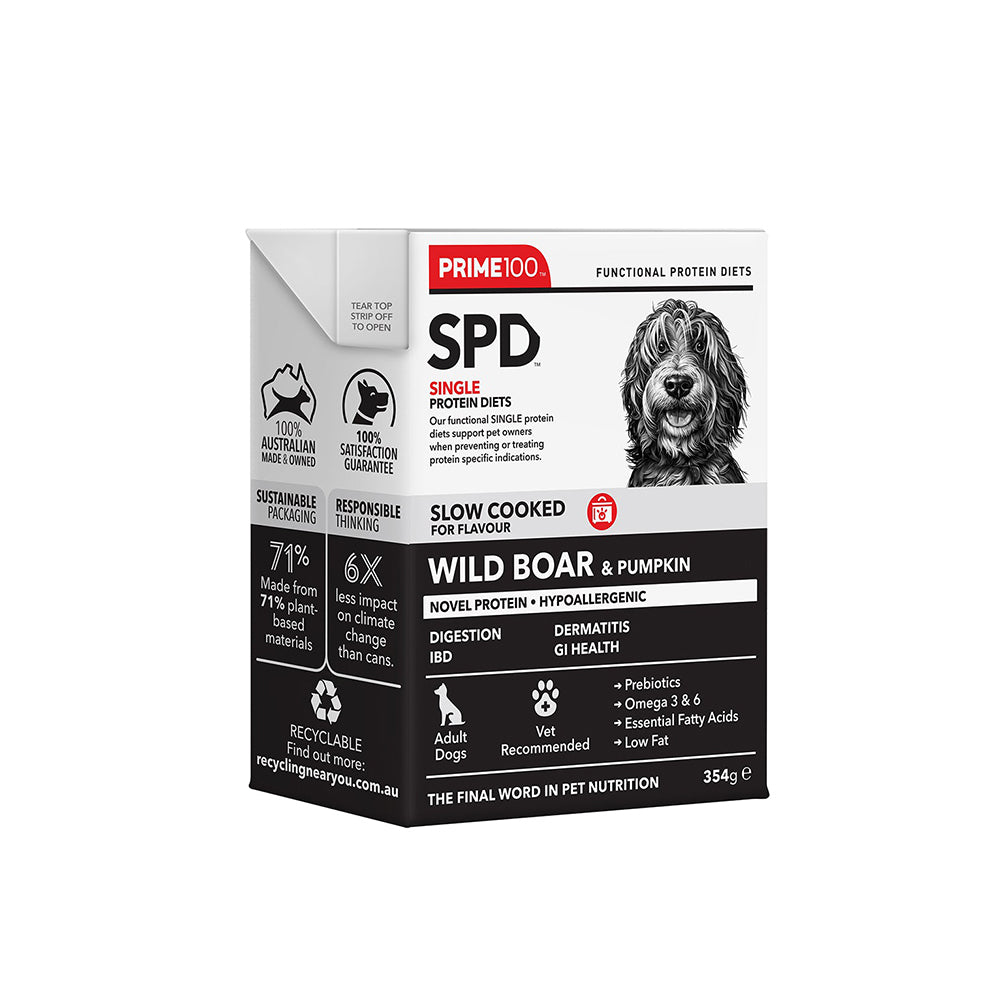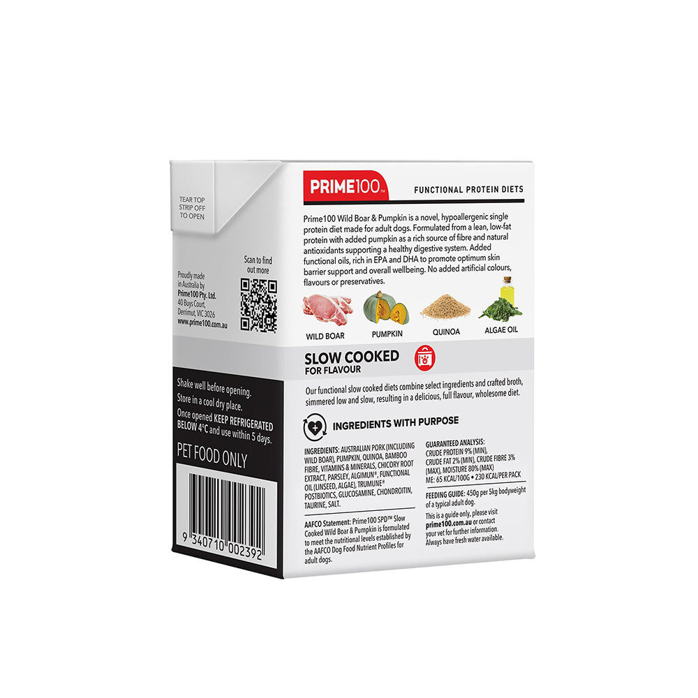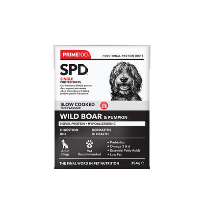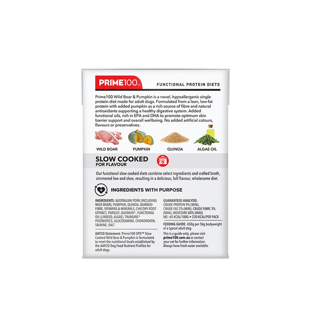 Prime100 Wild Boar & Pumpkin is a novel, hypoallergenic single protein diet made for adult dogs. Formulated from a lean, low-fat protein with added pumpkin as rich source of fibre and natural antioxidants supporting a healthy digestive system. Added functional oils, rich in EPA and DHA promote optimum skin barrier support and overall wellbeing. No added artificial colours, flavours or preservatives.