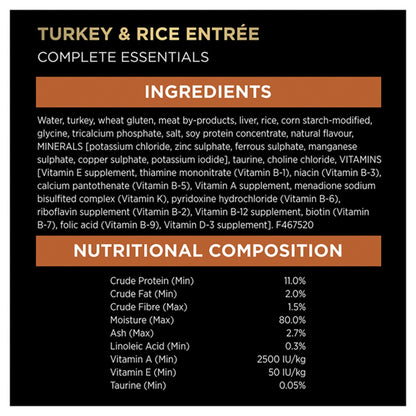 - Turkey & Rice Entrée In Gravy - Water, turkey, wheat gluten, meat by-products, liver, rice, corn starch-modified, glycine, tricalcium phosphate, salt, soy protein concentrate, natural flavour, MINERALS [potassium chloride, zinc sulphate, ferrous sulphate, manganese sulphate, copper sulphate, potassium iodide], taurine, choline chloride, VITAMINS.