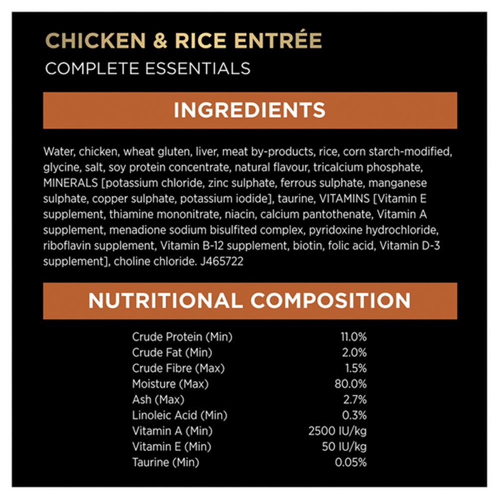 - Chicken & Rice Entrée in Gravy - Water, chicken, wheat gluten, liver, meat by-products, rice, corn starch-modified, glycine, salt, soy protein concentrate, natural flavour, tricalcium phosphate, MINERALS [potassium chloride, zinc sulphate, ferrous sulphate, manganese sulphate, copper sulphate, potassium iodide], taurine, VITAMINS, choline chloride.