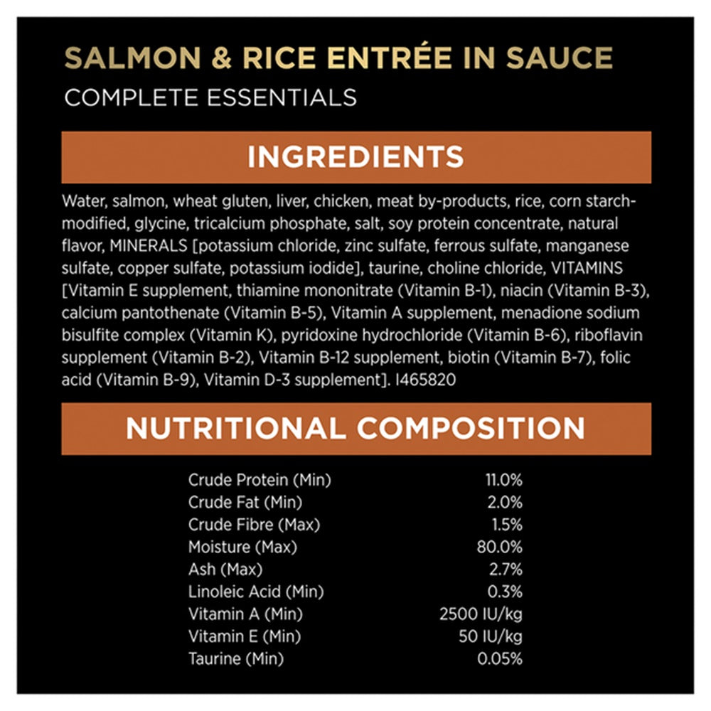 - Salmon & Rice Entrée in Sauce - Water, salmon, wheat gluten, liver, chicken, meat by-products, rice, corn starch-modified, glycine, tricalcium phosphate, salt, soy protein concentrate, natural flavor, MINERALS [potassium chloride, zinc sulfate, ferrous sulfate, manganese sulfate, copper sulfate, potassium iodide], taurine, choline chloride, VITAMINS [Vitamin E supplement, thiamine mononitrate (Vitamin B-1), niacin (Vitamin B-3), calcium pantothenate (Vitamin B-5), Vitamin A supplement, menadione sodium bisulfite complex (Vitamin K), pyridoxine hydrochloride (Vitamin B-6), riboflavin supplement (Vitamin B-2), Vitamin B-12 supplement, biotin (Vitamin B-7), folic acid (Vitamin B-9), Vitamin D-3 supplement].