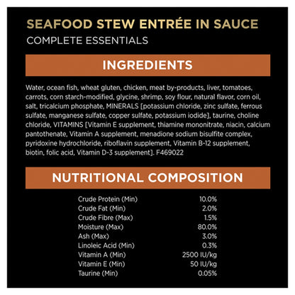 - Seafood Stew Entrée in Sauce - Water, ocean fish, wheat gluten, chicken, meat by-products, liver, tomatoes, carrots, corn starch-modified, glycine, shrimp, soy flour, natural flavor, corn oil, salt, tricalcium phosphate, MINERALS [potassium chloride, zinc sulfate, ferrous sulfate, manganese sulfate, copper sulfate, potassium iodide], taurine, choline chloride, VITAMINS [Vitamin E supplement, thiamine mononitrate, niacin, calcium pantothenate, Vitamin A supplement, menadione sodium bisulfite complex, pyridoxine hydrochloride, riboflavin supplement, Vitamin B-12 supplement, biotin, folic acid, Vitamin D-3 supplement].
