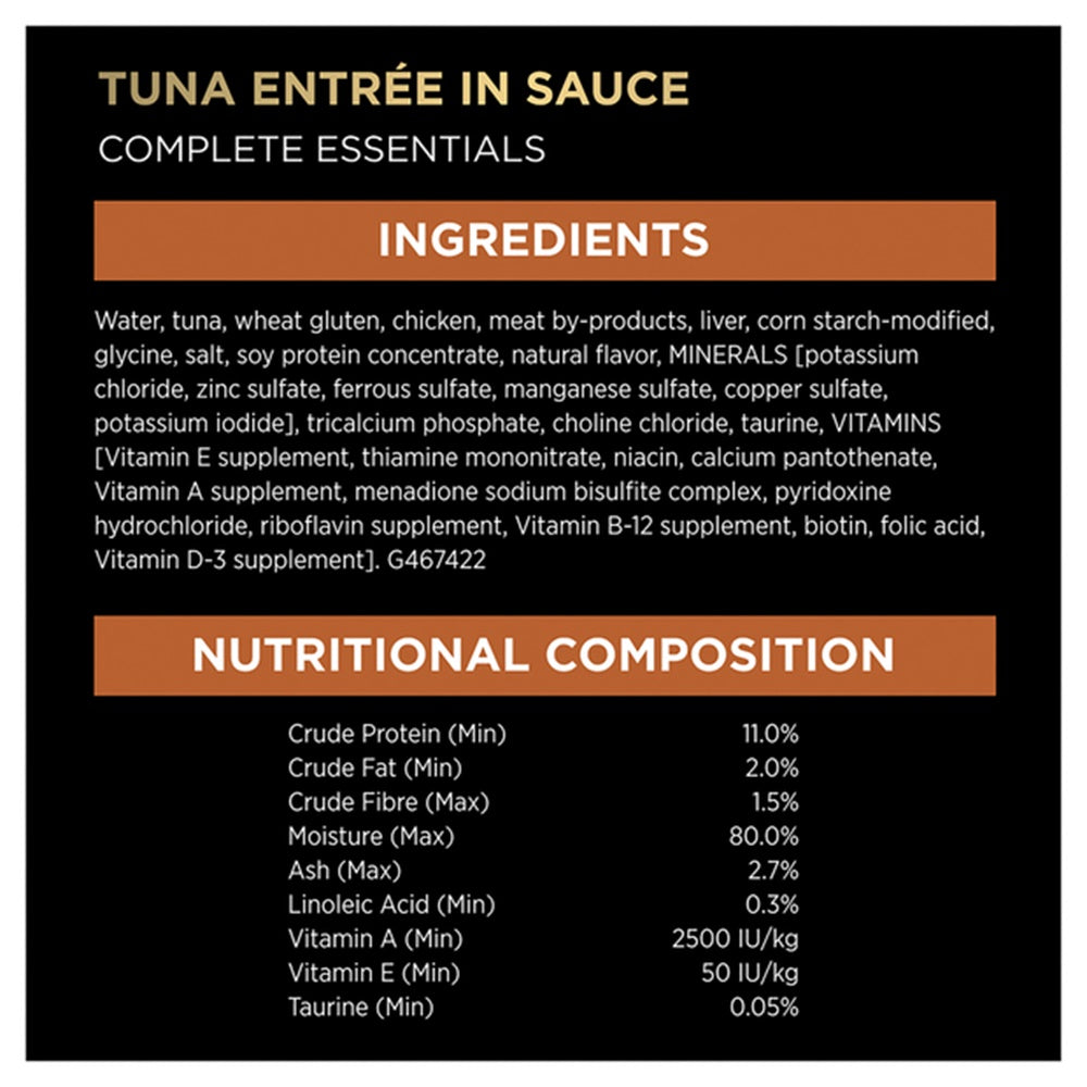 - Tuna Entrée in Sauce - Water, tuna, wheat gluten, chicken, meat by-products, liver, corn starch-modified, glycine, salt, soy protein concentrate, natural flavor, MINERALS [potassium chloride, zinc sulfate, ferrous sulfate, manganese sulfate, copper sulfate, potassium iodide], tricalcium phosphate, choline chloride, taurine, VITAMINS [Vitamin E supplement, thiamine mononitrate, niacin, calcium pantothenate, Vitamin A supplement, menadione sodium bisulfite complex, pyridoxine hydrochloride, riboflavin supplement, Vitamin B-12 supplement, biotin, folic acid, Vitamin D-3 supplement].