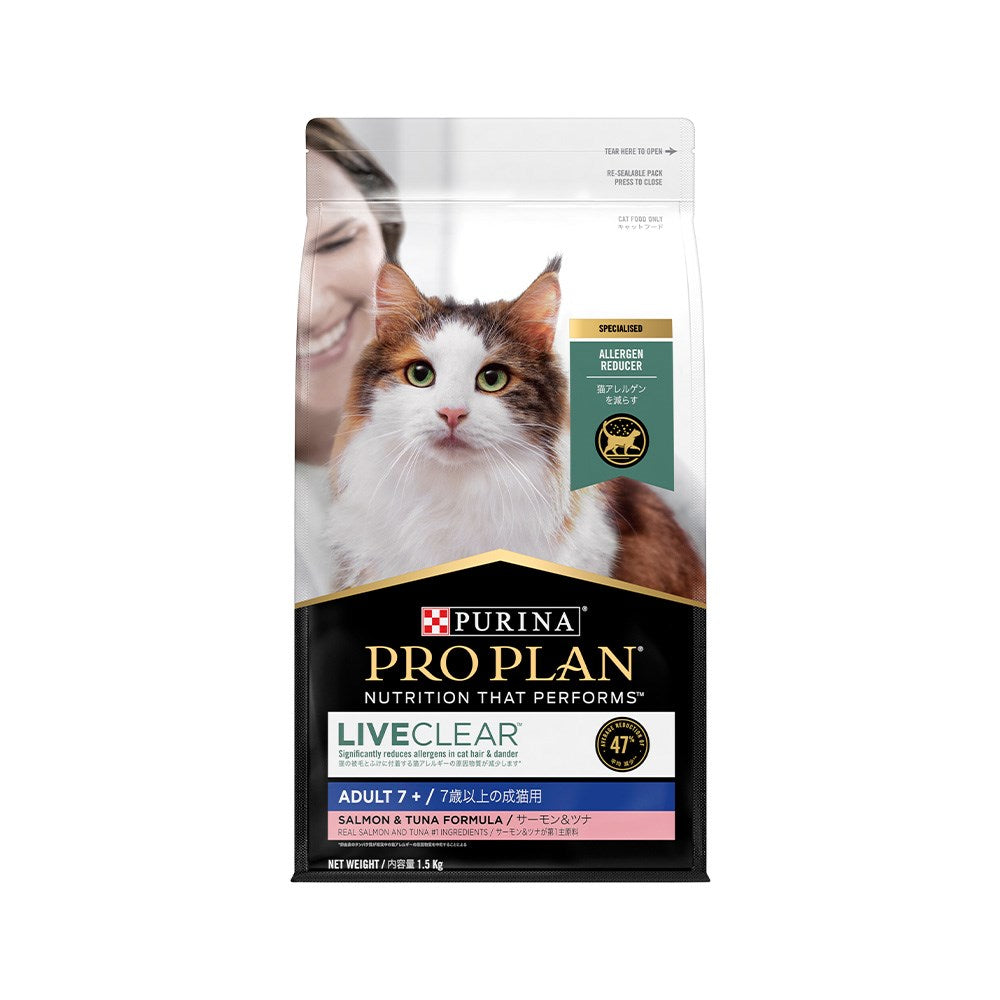 PRO PLAN Live Clear Salmon and Tuna Adult 7+ Dry Cat Food 1.5kg brings a breakthrough in feline nutrition with its unique formulation to reduce allergens in cat hair and dander by an average of 47%.