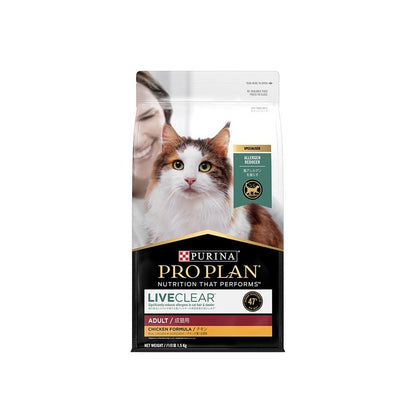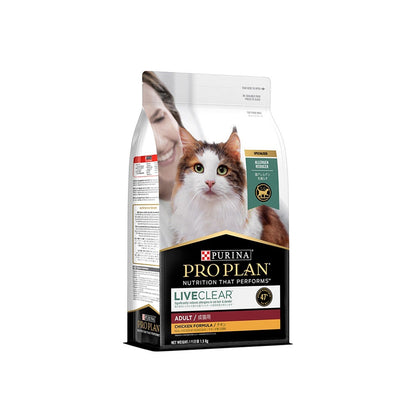 • PRO PLAN® LIVECLEAR™ ADULT , CHICKEN FORMULA has great-tasting, outstanding nutrition in an everyday food with the power to reduce allergens in cat hair and dander.