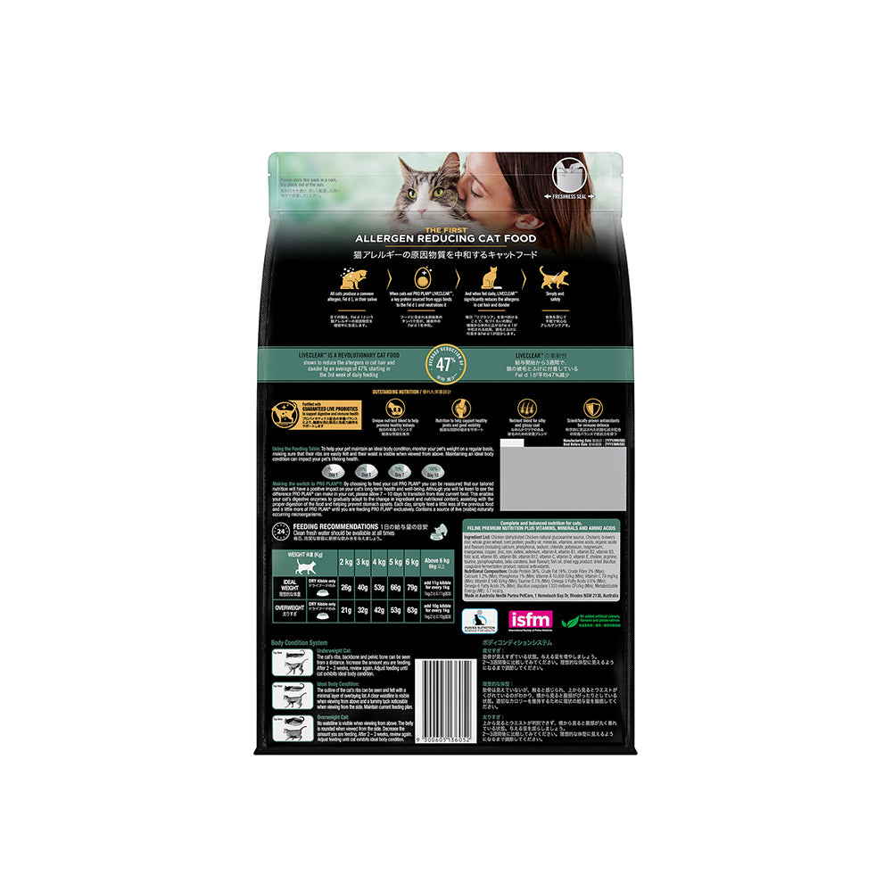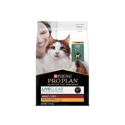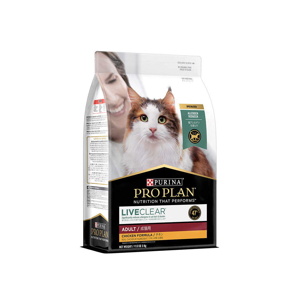 - PRO PLAN® LIVECLEAR™ ADULT , CHICKEN FORMULA has great-tasting, outstanding nutrition in an everyday food with the power to reduce allergens in cat hair and dander.
