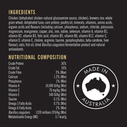 Chicken (Dehydrated Chicken- Natural Glucosamine Source, Chicken) Brewers Rice; Whole Grain Wheat; Dehydrated Tuna; Corn Protein; Poultry Oil; Minerals, Vitamins, Amino Acids, Organic Acids And Flavours (Including Calcium, Phosphorus, Sodium, Chloride, Potassium, Magnesium, Manganese, Copper, Zinc, Iron, Iodine, Selenium, Vitamin A, Vitamin B1, Vitamin B2, Vitamin B3, Folic Acid, Vitamin B5, Vitamin B6, Vitamin B12, Vitamin C, Vitamin D, Vitamin E, Choline, Arginine, Taurine, Pyrophosphates, Beta-carotene, Liver Flavour); Oats; Fish Oil; Dried Bacillus Coagulans Fermentation Product And Natural Antioxidants.