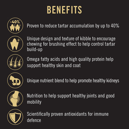 - Unmatched remarkable design and texture of kibble to stimulate chewing for “brushing effect”