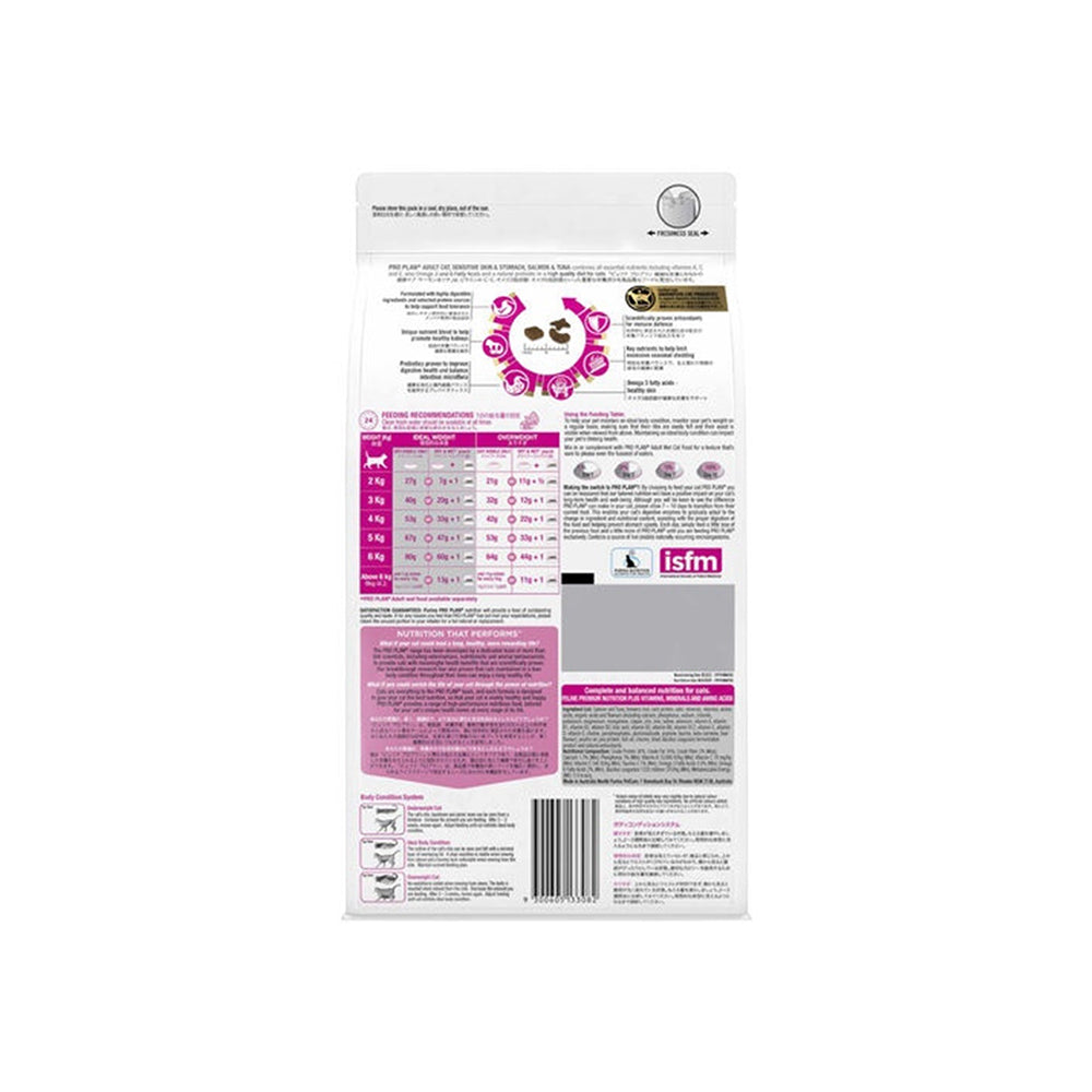 Salmon and Tuna; brewers rice; corn protein; oats; minerals, vitamins, amino acids, organic acids and flavours (including calcium, phosphorus, sodium, chloride, potassium, magnesium, manganese, copper, zinc, iron, iodine, selenium, vitamin A, vitamin B1, vitamin B2, vitamin B3, folic acid, vitamin B5, vitamin B6, vitamin B12, vitamin C, vitamin D, vitamin E, choline, pyrophosphates, aluminosilicate, arginine, taurine, beta-carotene, liver flavour); poultry oil; pea protein; fish oil; chicory; dried Bacillus coagulans fermentation product and natural antioxidants.