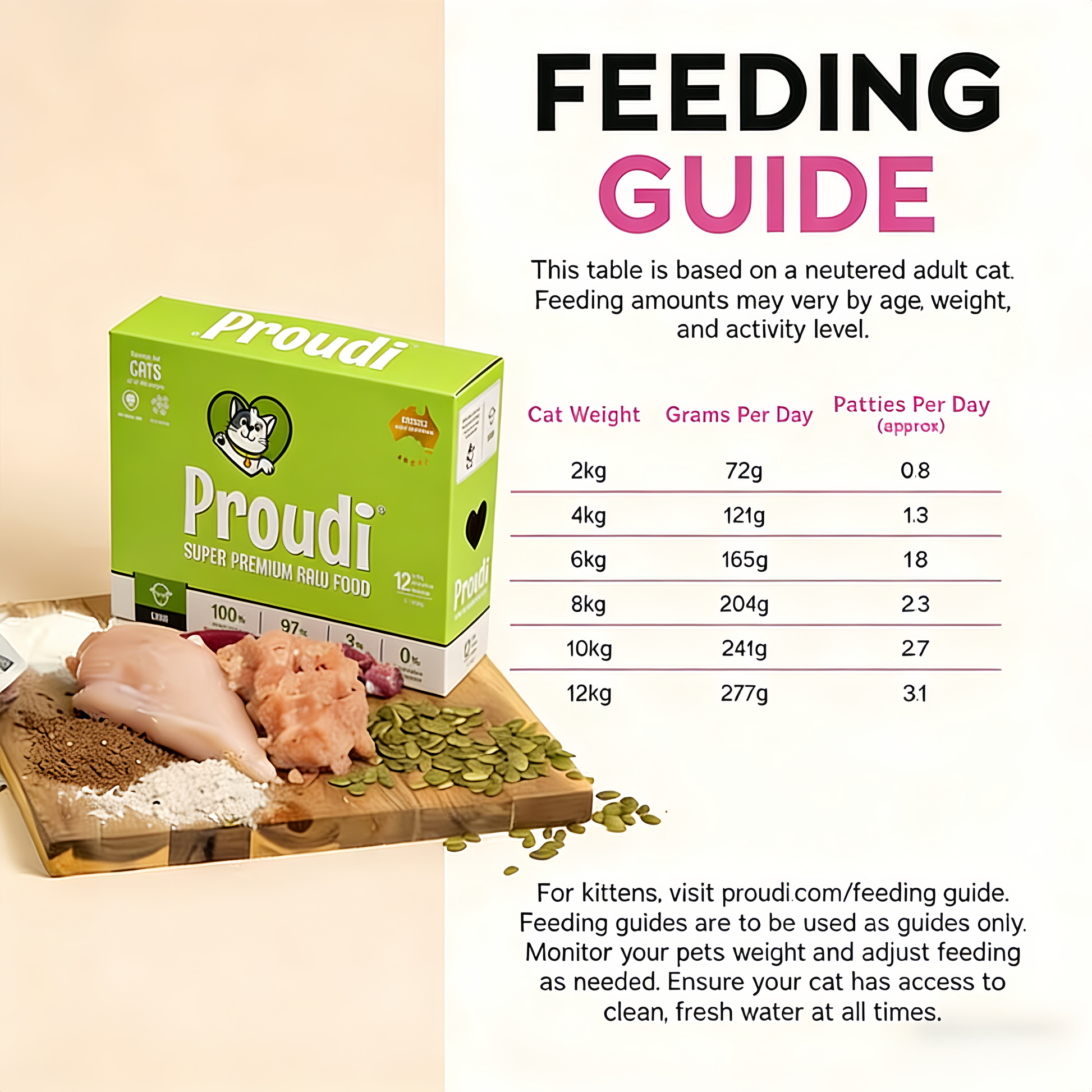 This recipe provides a complete and balanced meal for cats of all ages. Made from 100% Australian human-grade lamb – including essential organs – these single-protein patties deliver all the full benefits of Proudi’s trusted formula in every bite.