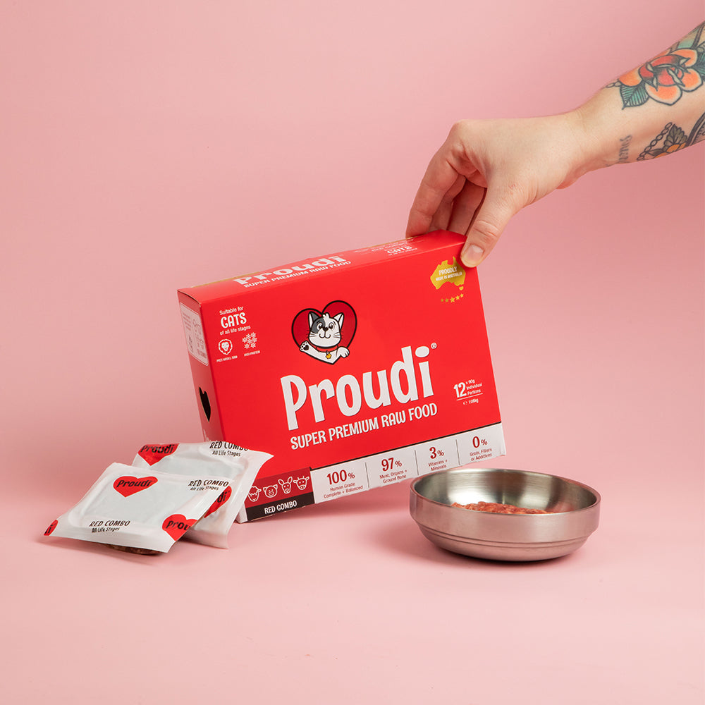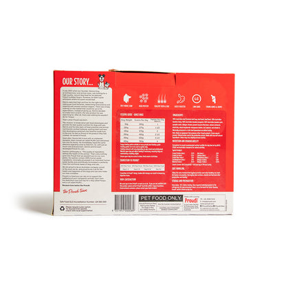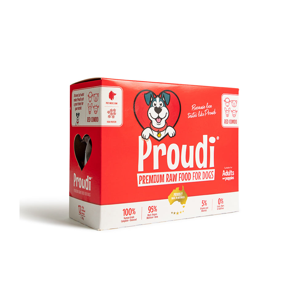 Proudi Premium Red Combo Patties for Dogs are the ultimate crowd pleaser. This recipe is made from a delicious blend of four red meats - sheep, kangaroo, pork meat and beef offal - and is a great choice for fussy eaters or dogs with white meat intolerances.