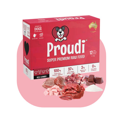 Proudi Raw Red Combo for dogs exceeds all nutrient levels required by AAFCO and FEDIAF for adult dogs and puppies.