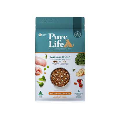 Reward your dog while providing them with the best of nature today with the PURE LIFE Natural Boost Chicken Grain Free Dog Food for Adult Dogs 8kg! Being 100% Australian-made and owned along with the 96% local and freshly sourced ingredients, this dog dry food consists of only the best chunks of freeze-dried and protein-rich chewy meat! The superfood blends are added with natural fibres, antioxidants and vitamins for maximum performance and digestion health for your dog. Having a natural source of Omega 3 fatty acids will support naturally shiny skin and coat while allowing their joints to be in perfect condition and reduce the chances of inflammation.