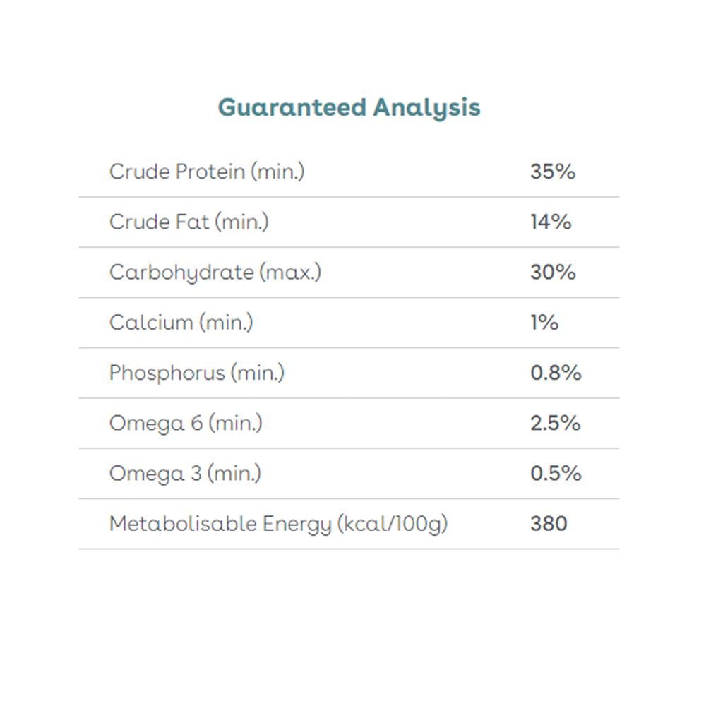 Chicken Meal & Chicken Freeze Dried Meat, Faba Beans, Chickpeas, Chicken Fat with Mixed Tocopherols & Rosemary Extract, Chicken Gravy, Potato Starch, Vitamins & Minerals (including Calcium, Phosphorus, Potassium, Magnesium, Iron, Copper, Manganese, Zinc, Iodine, Selenium, Vitamins A, C, D3, E, B1, B2, B3, B5, B6, B9, B12, Choline), Beet Pulp, Sunflower Oil, Sea Salt, Flax Seed Oil, Chicory Extract, Fish Oil, Coconut Oil, Egg Powder, Taurine, DL-Methionine, Yucca Extract, Emu Oil, Carrot, Yoghurt Powder, Spinach Powder, Broccoli Powder, Kale Powder, Alfalfa Meal, Dried Apple, Tomato Powder, Chia Seed, Kelp Powder, Sweet Potato Powder, Turmeric, Almond Flour, Parsley, Sumac, Green Tea, Blueberry Extract, Cranberry Extract.