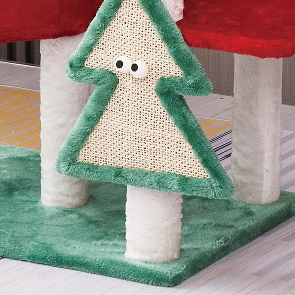 Red & Green Patchwork Christmas Cat House And Tree filled with cotton, shaped like a cheerful Christmas tree adorned with vibrant plush balls that add a lively touch. It includes a cozy plush hammock perfect for stretching out, and a warm, private Christmas cat house. The durable big-eyed cat scratching board is scratch-resistant and paw-friendly, allowing unrestricted play. A semi-enclosed lookout offers a wider view, while multi-level jumping platforms provide spacious tiers for easy movement. Thoughtfully designed, this cat tree meets all of your cat's needs, offering a well-structured play area for endless enjoyment.