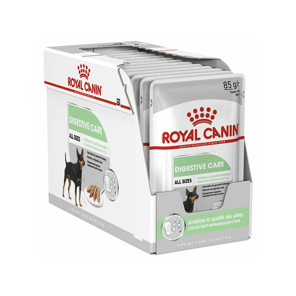 ROYAL CANIN Digestive Care Loaf Wet Dog Food is a high-quality, complete diet that meets the nutritional needs of your dog. This is because it contains highly digestible proteins and high-quality prebiotics and fibres, as well as an effective digestive aid to help promote intestinal comfort. The high protein level in ROYAL CANIN Digestive Care Loaf Wet Dog Food food helps maintain a healthy weight and muscle mass, enhancing agility and aerobic performance. The combination of highly digestible proteins together with prebiotics promotes a balanced gut flora – resulting in optimal digestion.