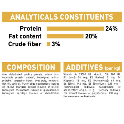 Rice, Dehydrated Poultry Protein, Animal Fats, Vegetable Protein Isolate*, Hydrolysed Animal Proteins, Vegetable Fibres, Beet Pulp, Minerals, Fish Oil, Soya Oil, Fructooligosaccharides, Borage Oil (0.1%), Marigold Extract (Source Of Lutein), Hydrolysed Crustaceans (Source Of Glucosamine), Hydrolysed Cartilage (Source Of Chondroitin). Vitamin A: 29500 Iu, Vitamin D3: 800 Iu, E1 (Iron): 56 Mg, E2 (Iodine): 5 Mg, E4 (Copper): 13 Mg, E5 (Manganese): 63 Mg, E6 (Zinc): 142 Mg, E8 (Selenium): 0.15 Mg, Clinoptilolite Of Sedimentary Origin: 10 G, Tea Extract (Source Of Polyphenols): 150 Mg - Preservatives - Antioxidants.