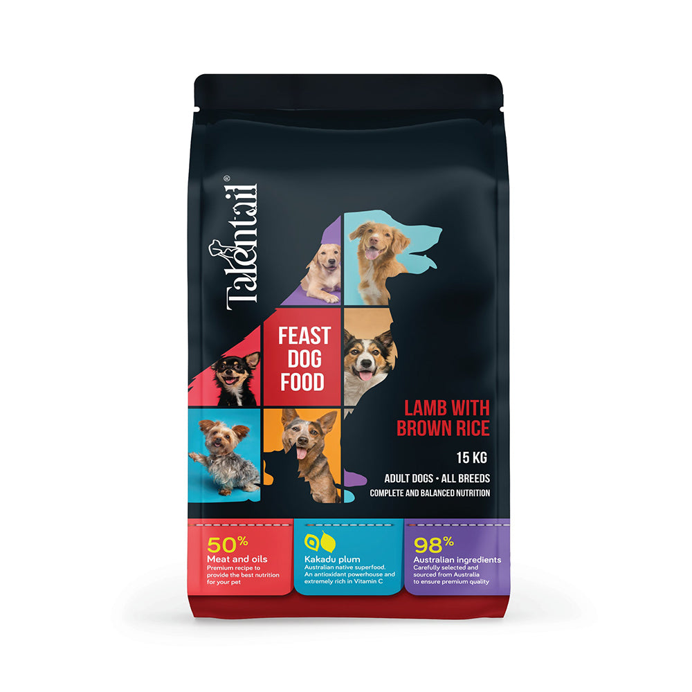 TALENTAIL Lamb with Brown Rice Kibble Dog Food for Adult Dogs 15kg is a nutritious food that your four-legged friend will love and enjoy! Made from high-quality lamb and brown rice from Australia, packed with vitamins, minerals and antioxidants that are essential for the health and wellbeing of your pets with the unique addition of Kakadu Plum powder which is an extremely rich source of vitamin C, E and natural antioxidants give your pup the complete and balanced nourishment they need to be active all day long!