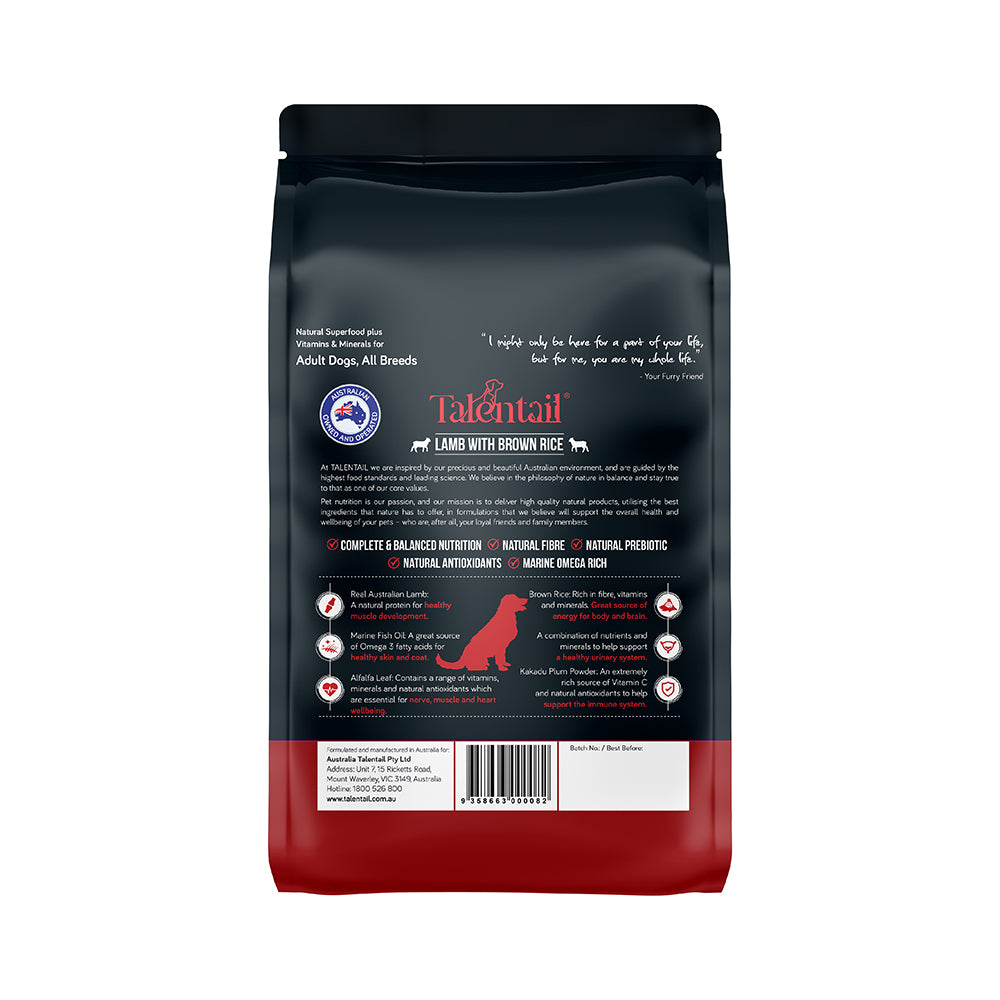 TALENTAIL Lamb with Brown Rice Kibble Dog Food for Adult Dogs 3.5kg is a nutritious food that your four-legged friend will love and enjoy! Made from high-quality lamb and brown rice from Australia, packed with vitamins, minerals and antioxidants that are essential for the health and wellbeing of your pets with the unique addition of Kakadu Plum powder which is an extremely rich source of vitamin C, E and natural antioxidants give your pup the complete and balanced nourishment they need to be active all day long!