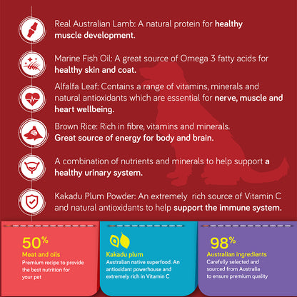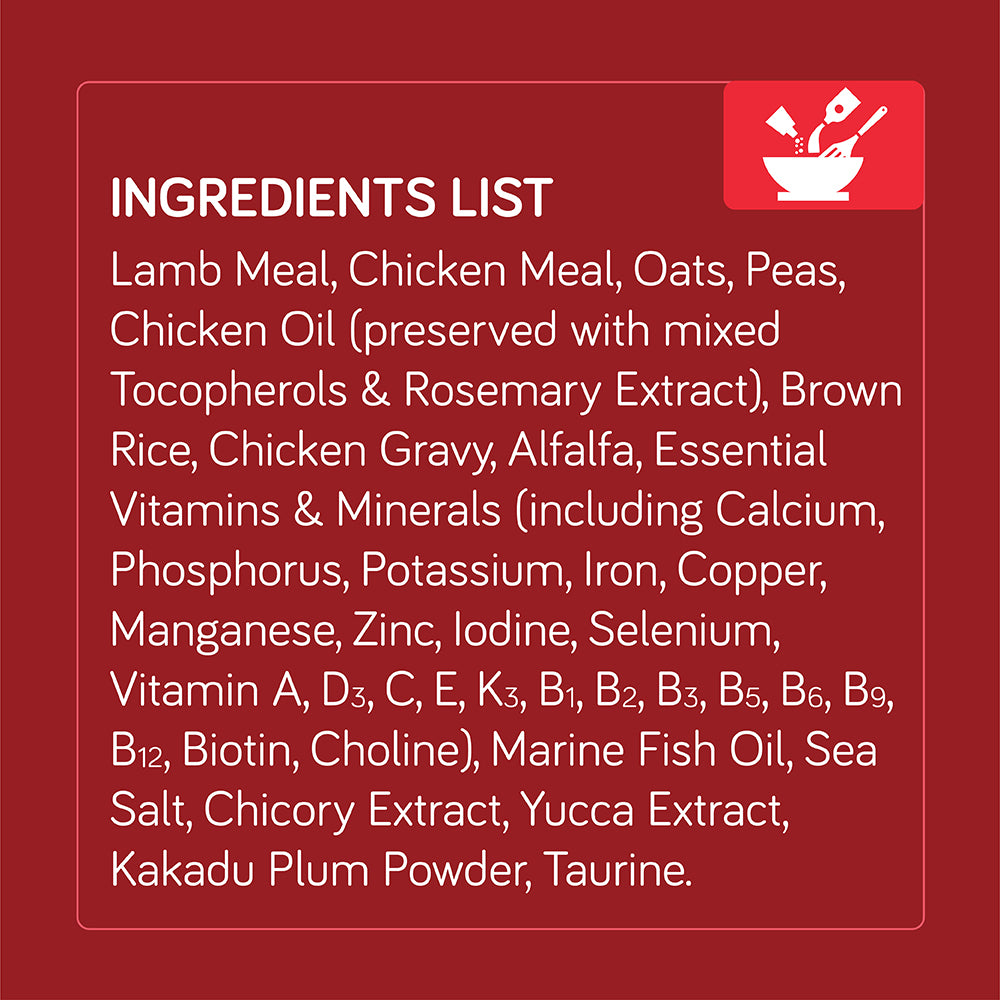 Australian Lamb, Lamb Meal, Fava Beans, Oats, Brown Rice, Chicken Oil (Preserved With Mixed Tocopherols And Rosemary Extract), Chicken Gravy, Alfalfa, Apple, Essential Vitamins And Minerals (Including Calcium, Phosphorus, Potassium, Iron, Copper, Manganese, Zinc, Iodine, Selenium, Vitamins A, D3c, E, K3, B1, B2, B3, B5, B6, B9, B12, Biotin, Choline), Marine Fish Oil, Sea Salt, Chicory, Kakadu Plum Powder and Taurine.