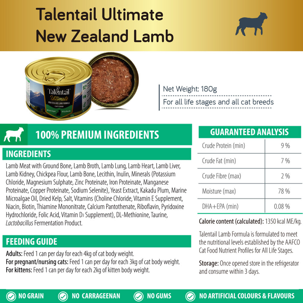 Talentail Ultimate Lamb Cat Food is made with pasture-raised lamb from New Zealand, providing essential vitamins, minerals, and amino acids. It includes over 92% lamb, organs and broth ensuring top-quality nutrition for your cat. The unmatched quality and high-energy nutrition make it perfect for active cats, growing kittens, and pregnant and nursing mothers. This formula contains prebiotics and postbiotics for gut health, digestion, and immune support. Enriched with 360mg of algae oil for Omega-3 benefits, and it is also enhanced with Kakadu Plum Powder rich in vitamin C and antioxidants, lecithin for skin, coat, and brain health, chicory inulin for enhanced digestion, and dried kelp for thyroid function and overall health.