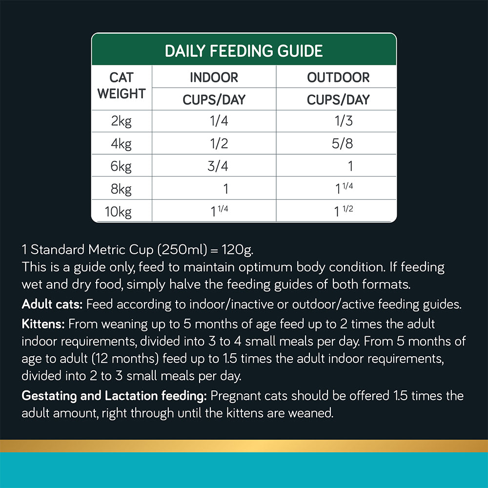Kittens: From weaning up to 5 months of age feed up to 2 times theadult indoor requirements, divided into 3 to 4 small meals per day. From5 months of age to adult