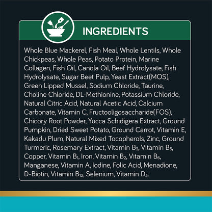 70% Fish and Oils (Blue Mackerel, Wild-caught White Fish Meal, 6% Marine Collagen, 5% Premium Fish Oil, 4% Canola Oil, Premium Fish Hydrolysate, Premium Beef Hydrolysate), a Broad Range of Fruits and Vegetables (Whole Lentils, Whole Chickpeas, Whole Peas, Potato Protein, Sugar Beet Pulp, Chicory Root Powder, Ground Pumpkin, Dried Sweet Potato, Ground Carrot, Kakadu Plum and Rosemary Extract), Vitamins and Minerals, Green Lipped Mussel, Salt, Taurine, FOS, Yeast Extract(MOS), Yucca Schidigera Extract, Natural Citric Acid, Natural Acetic Acid, Ground Turmeric.