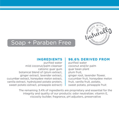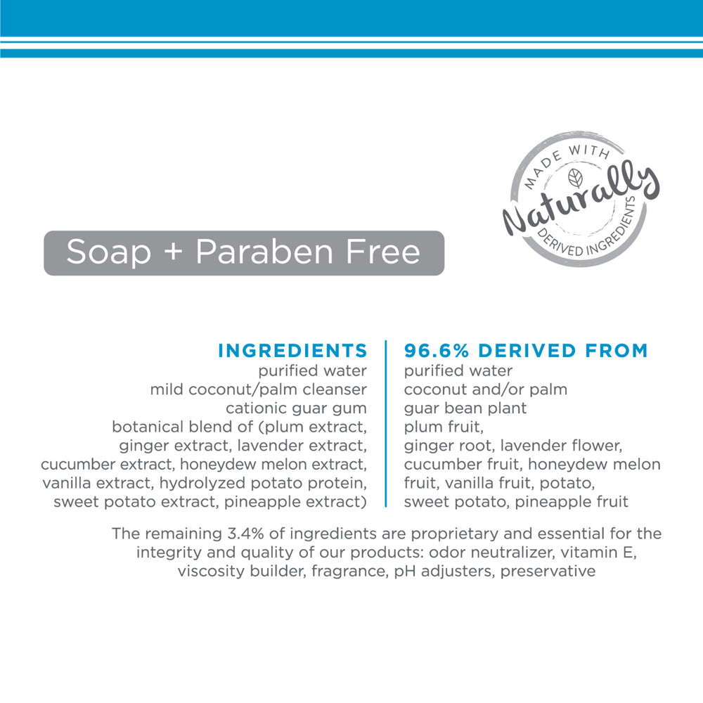 Purified Water, Mild Coconut/Palm Cleanser, Cationic Guar Gum, Botanical Blend Of (Plum Extract, Ginger Extract, Lavender Extract, Cucumber Extract, Honeydew Melon Extract, Vanilla Extract, Hydrolyzed Potato Protein, Sweet Potato Extract, Pineapple Extract), Odor Neutralizer, Vitamin E, Viscosity Builder, Fragrance, pH Adjusters, Preservative.