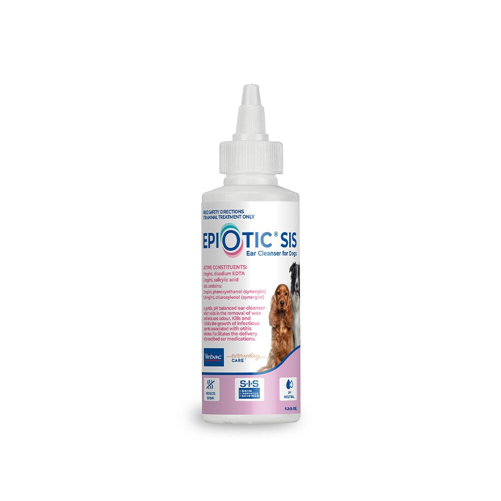 VIRBAC Epiotic SIS Dog Ear Cleanser 120ml is a gentle yet powerful pH-balanced ear cleanser for dogs. Its unique formula aids in removing wax, reduces odour, and inhibits the growth of infectious agents associated with otitis externa. The solution features SIS technology that limits microbial adherence and stimulates the skin's natural defence mechanisms and anti-odour technology that neutralises unpleasant smells and provides a mild citrus aroma.