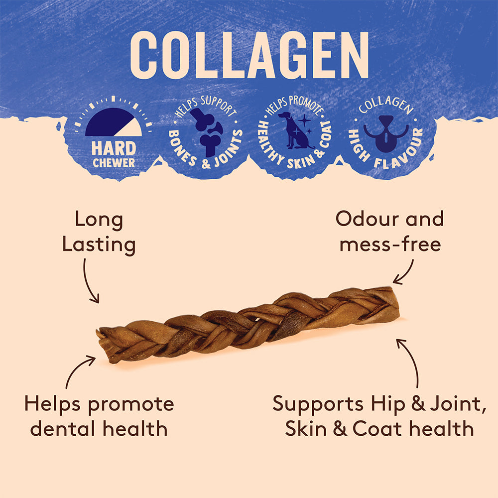 Made from 100% beef meat and beef collagen, this braided chew is naturally rich in collagen peptides and amino acids to help support joint health, mobility and overall wellbeing. The firm, braided texture encourages longer chewing time, making it ideal for enrichment, boredom relief and dental engagement.