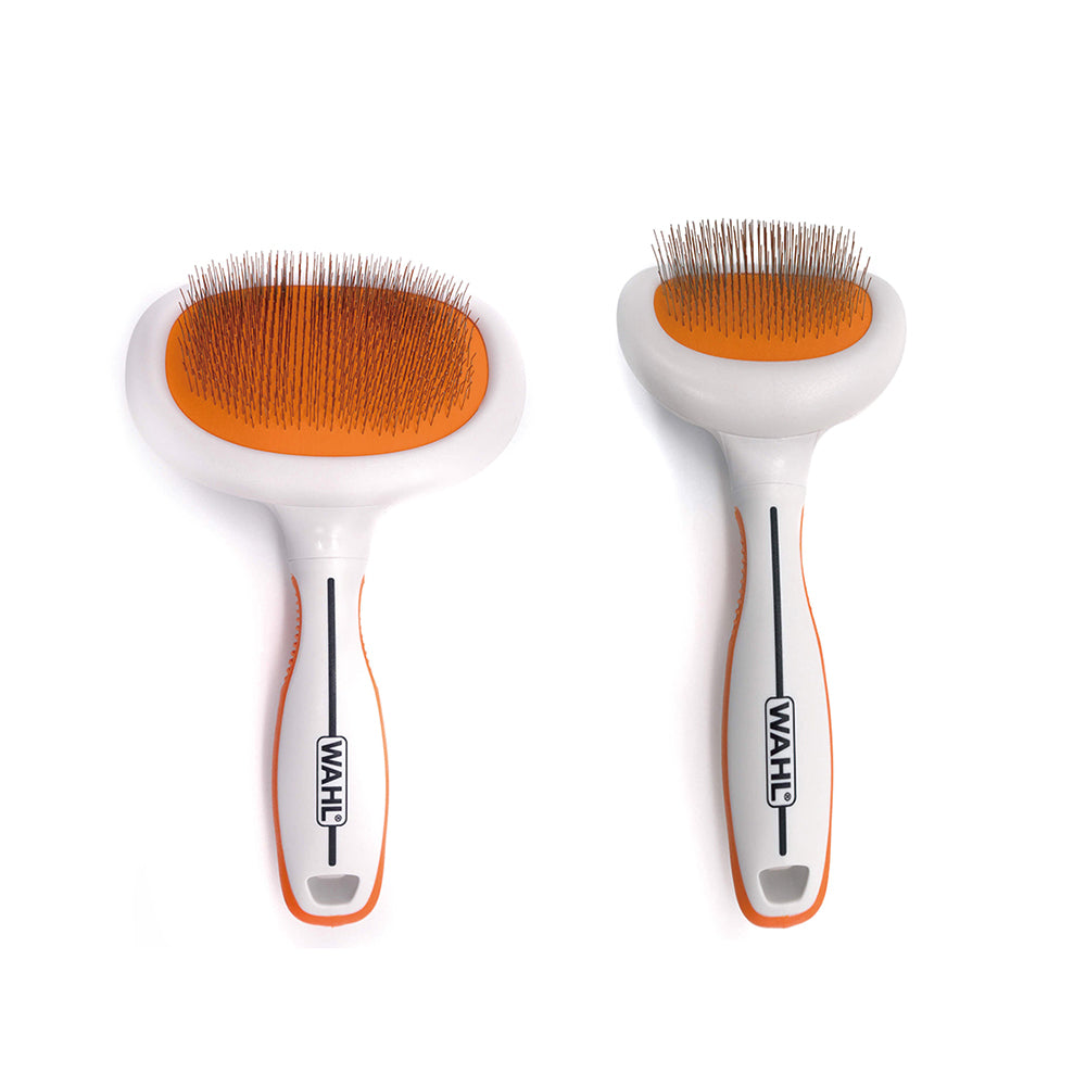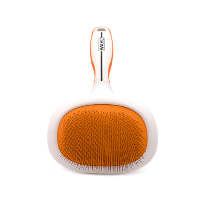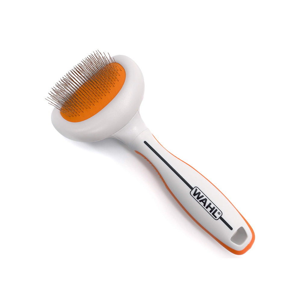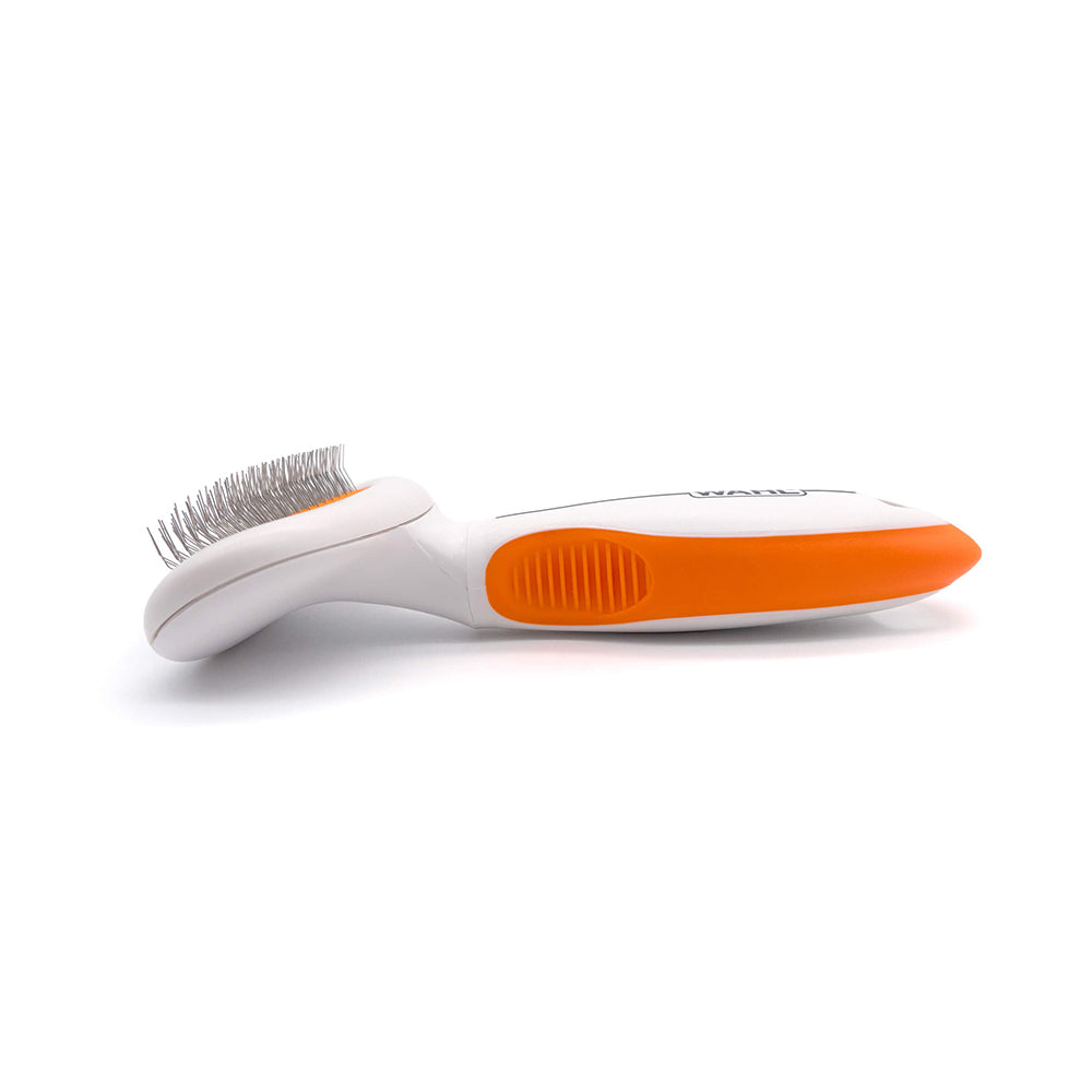 WAHL brush features curved corners for a secure grip, allowing groomers better control when working on the coat. It efficiently removes loose hair and debris, while the angled tip bristles safely aid in deshedding and promote healthy coats. It's perfect for long-haired breeds and works wonders on double coats, leaving your pet looking and feeling their best.