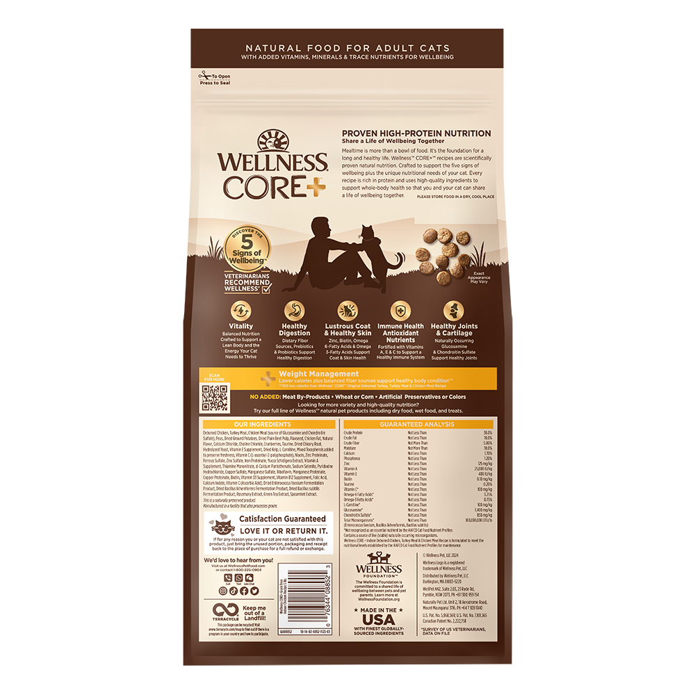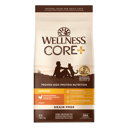 Healthy, grain-free, gluten-free and no artificial flavours and preservatives. Keep your kitty's heart, healthy free of preservatives, and still love the taste of chicken! The new WELLNESS Core Grain Free Indoor Cat Food 2.27kg is packed with important nutrients and offers a complete and balanced recipe that's as tasty as it is healthy that will keep your cat happy and energized.