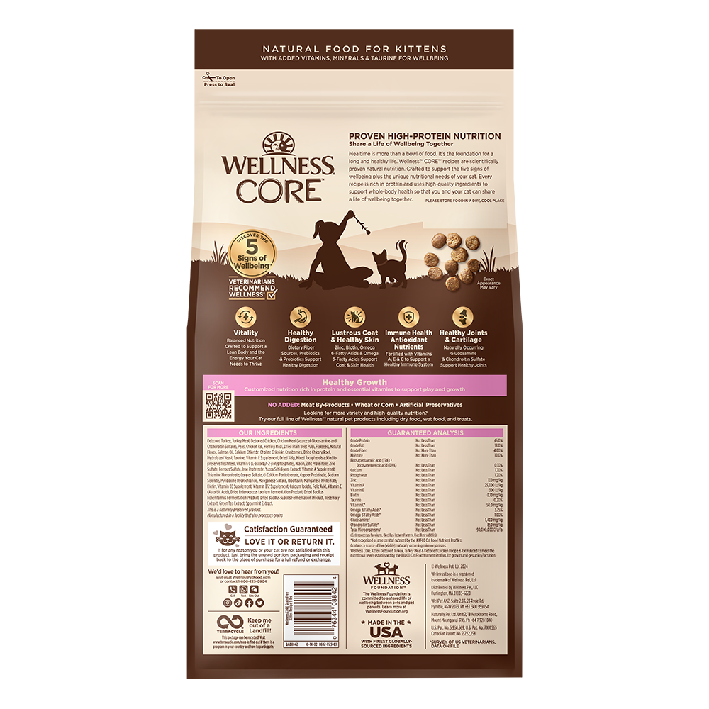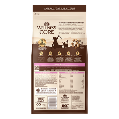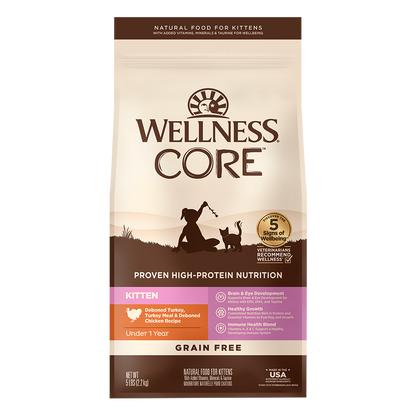WELLNESS Core Turkey & Chicken Grain Free Cat Food for Kittens 2.27kg is for all the kitten lovers out there who like to follow the latest trends in their pet's diet. Produced with high-quality, all-natural ingredients such as deboned turkey and chicken, this grain-free formula contains 55% highly digestible protein. Wellness Core range also includes probiotics to support your kitten’s digestive health and rich Omega 3 that provides skin healthy nutrition while containing antioxidants proven to protect against free radicals for a happy and healthy kitty.