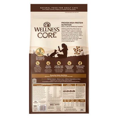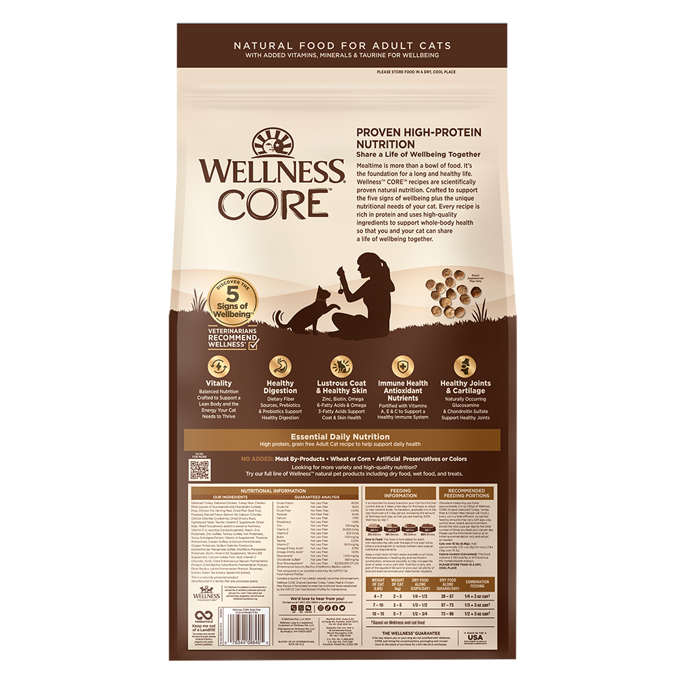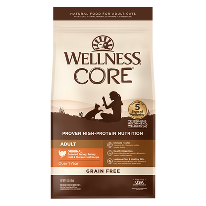 Embrace 100% of their natural instinctual eating behaviours through balanced taste preferences with a blend of quality meats such as turkey and chicken as well as vegetables, fruits and spices. The perfect food for them is WELLNESS Core Original Turkey & Chicken Grain Free Cat Food for Adult Cats 2.27kg. Gluten and grain-free, rich in vitamins, probiotics, and antioxidants to nourish your cat's overall health!