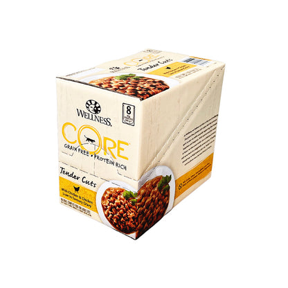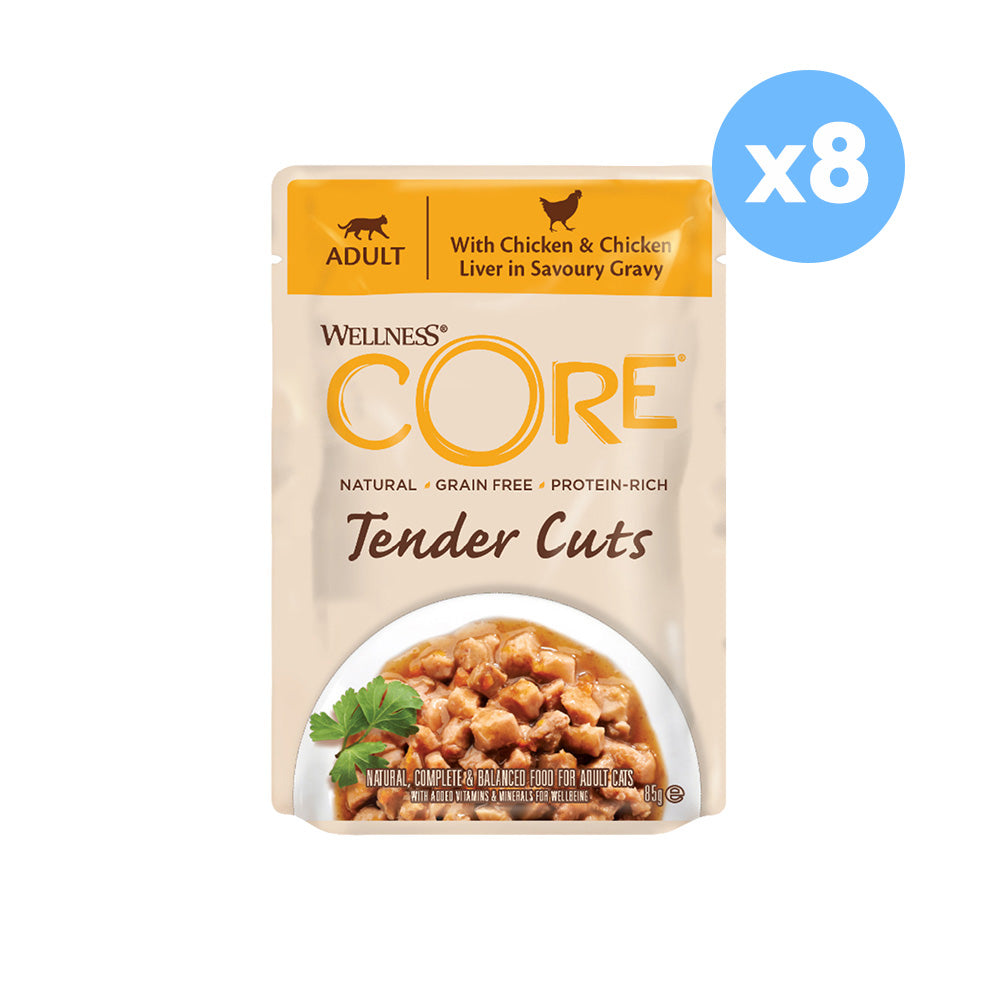 With taste in mind but health at heart: our Wellness CORE Tenders Cuts with Chicken & Chicken Liver in Savoury Gravy are grain-free, natural, slow cooked tender cuts of poultry combined with healthy veggies and fruits served in savoury sauces that deliver an irresistible taste. Our Tender Cuts are complete and balanced meals with a range of protein-rich recipes to keep mealtime tasty and tender, savoury, saucy and fresh to please even the most finicky of eaters.