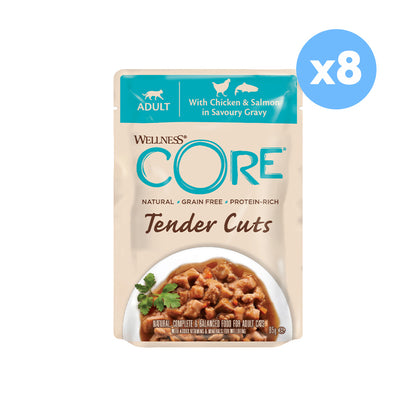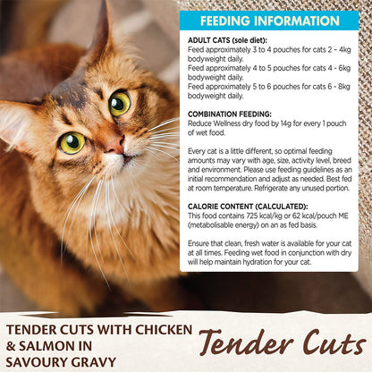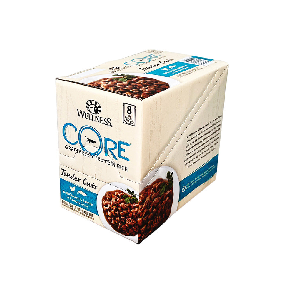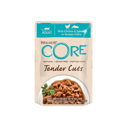 Delicious and nutritious, the Wellness Core Tender Cuts with Chicken and Salmon in Savoury Gravy is a premium choice for feline friends. The carefully crafted recipe blends high-quality proteins, essential vitamins, and antioxidant-rich ingredients like cranberries and blueberries in a tasty gravy thats sure to tantalize your cats taste buds.