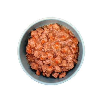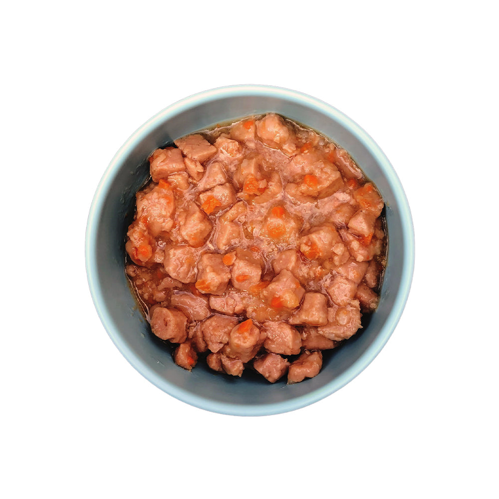 Chicken Broth, Chicken 22%, Salmon 6%, Potato Starch, Eggs, Carrots 3%, Chicken Liver, Minerals, Cranberries, Blueberries, White Sweet Potatoes. NUTRITIONAL ADDITIVES (per kg):Taurine 1,540 mg, Vitamin A 14,240 IU, Vitamin D3 420 IU, Vitamin E 64 mg, Zinc chelate of amino acids, hydrate 113 mg, Ferrous chelate of amino acids, hydrate 77 mg, Manganese chelate of amino acids, hydrate 27 mg, Cupric chelate of amino acids, hydrate 18 mg, Potassium Iodide 0.2 mg, Sodium Selenite 0.065 mg