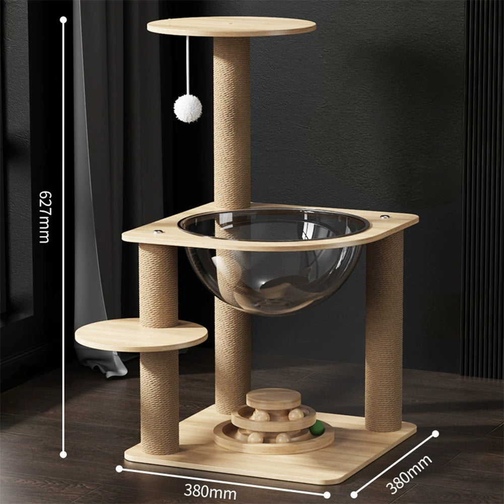 Transform your home into a feline paradise with our premium wooden cat tree featuring sisal scratching posts and a modern acrylic space pod. This multi-level climbing structure combines natural wood aesthetics with contemporary design, providing your cat with the perfect playground for climbing, scratching, perching, and observing their kingdom.