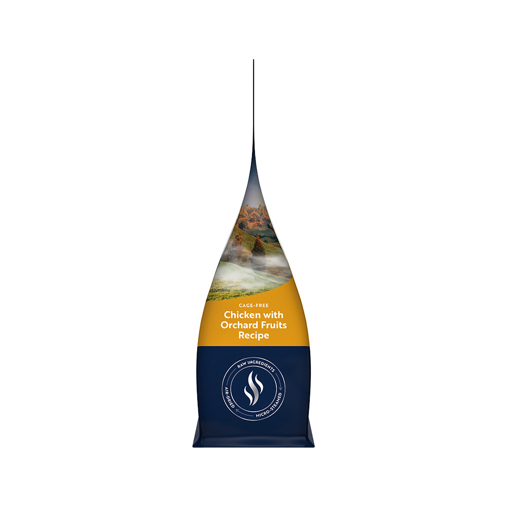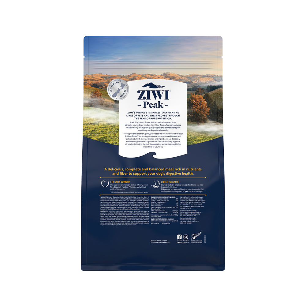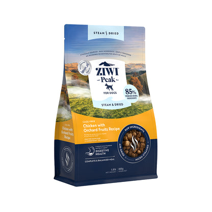 ZIWI PEAK Steam-Dried Cage-free Chicken with Orchard Fruits Dog Food,a complete recipe using ethically-sourced raw chicken from New Zealand, blended with orchard fruits and chicory root for digestive health. Utilizes Z-MicroSteam™ technology for optimum nourishment. Features 85% premium raw meats, pillow-shaped bites, and added prebiotics, fibers, Omega-3, glucosamine, calcium, and phosphorus for balanced nutrition suitable for all life stages.
