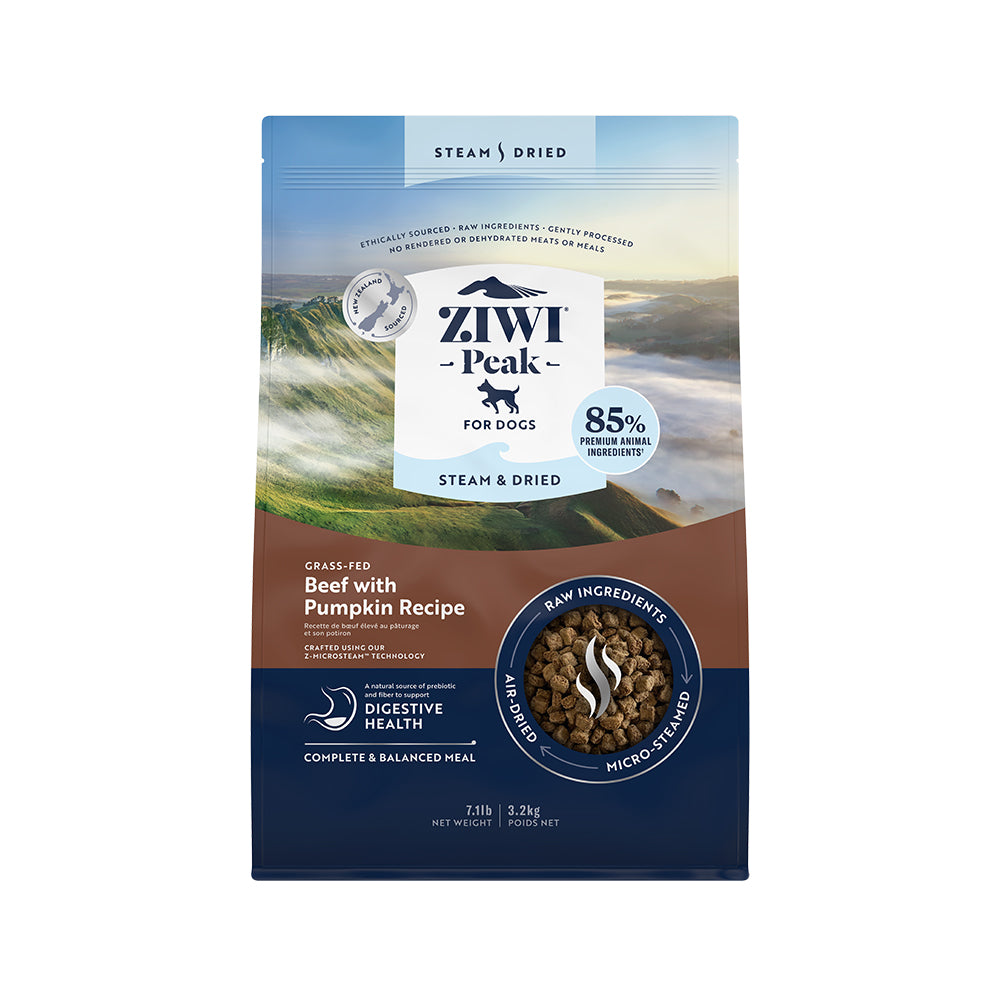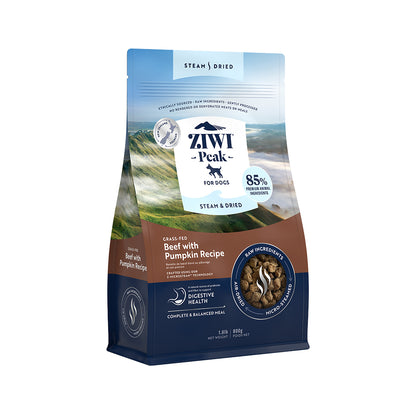 ZIWI PEAK Steam-Dried Grass-fed Beef with Pumpkin Dog Food, a balanced recipe suitable for all life stages, featuring 85% premium raw meats and organs in convenient pillow-shaped bites. Includes prebiotics and fiber for digestive health, along with essential nutrients like Omega-3, Calcium, and Phosphorus. Supports joint health with Glucosamine and Chondroitin. No dried or rendered meats, making it an ideal complete meal or base for customized bowls.