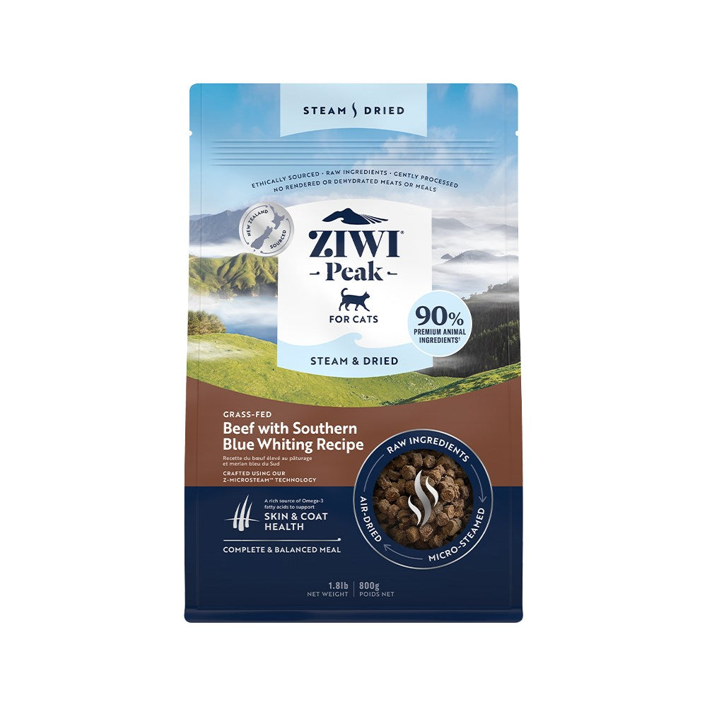 ZIWI PEAK Steam-Dried Grass-fed Beef with Southern Blue Whiting Cat Food offers 90% premium raw meats and organs, ensuring a complete and balanced meal for any life stage. With delicious pillow-shaped bites for a light crunch, it's a convenient raw alternative, perfect for scooping and serving. Enriched with prebiotics, fibre, and essential nutrients like Omega-3 fatty acids, Taurine, Glucosamine, Calcium, and Phosphorus, it supports overall health, including digestion, skin, brain, vision, heart, and joint function. No dried or rendered meats are used, making it a wholesome choice for your cat's well-being.