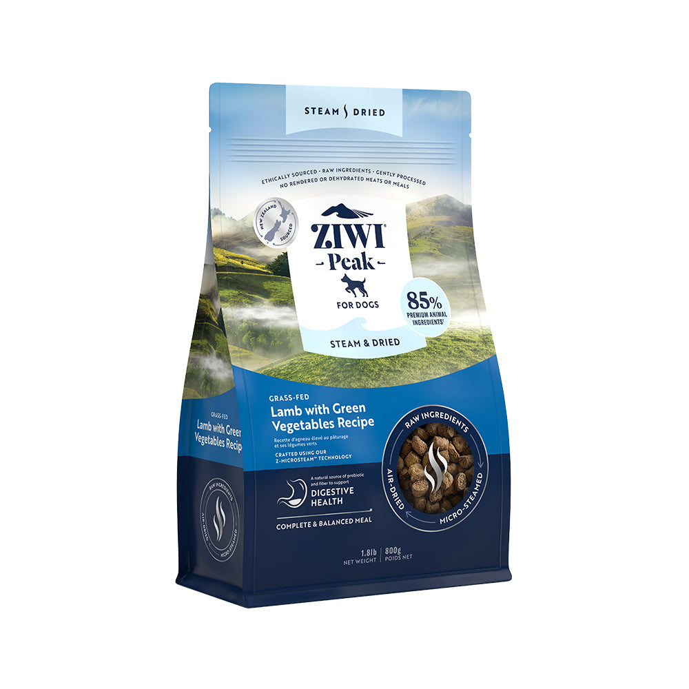 ZIWI PEAK Steam-Dried Grass-fed Lamb with Green Vegetables Dog Food with 85% premium raw meats and organs, offering pillow-shaped bites for a satisfying crunch. Convenient and versatile, it serves as a complete meal or base for custom bowls. Enriched with prebiotics, fiber, glucosamine, Omega-3, calcium, and phosphorus, it supports digestive health, joint function, brain development, and bone strength, suitable for all life stages.