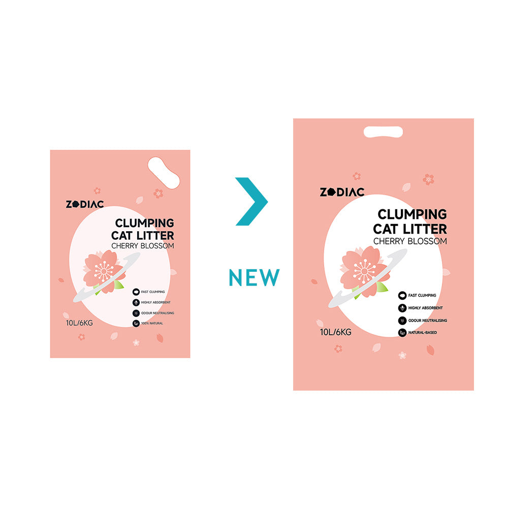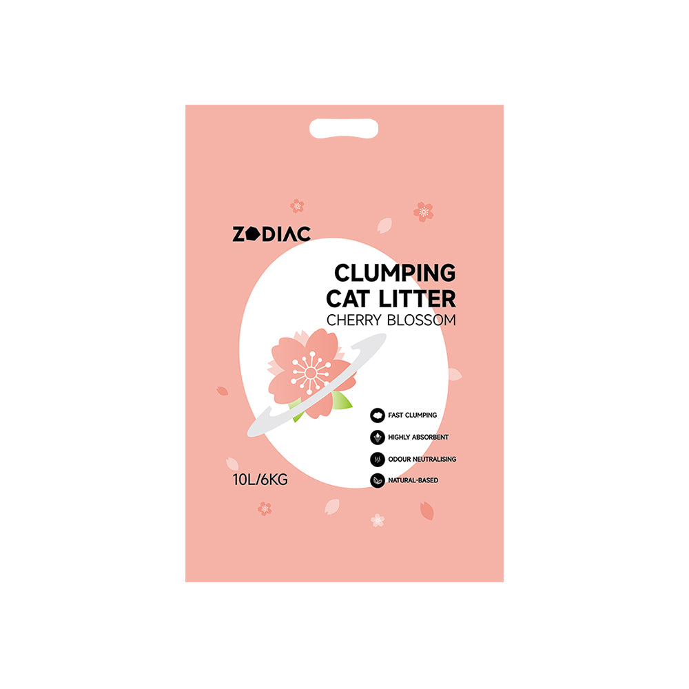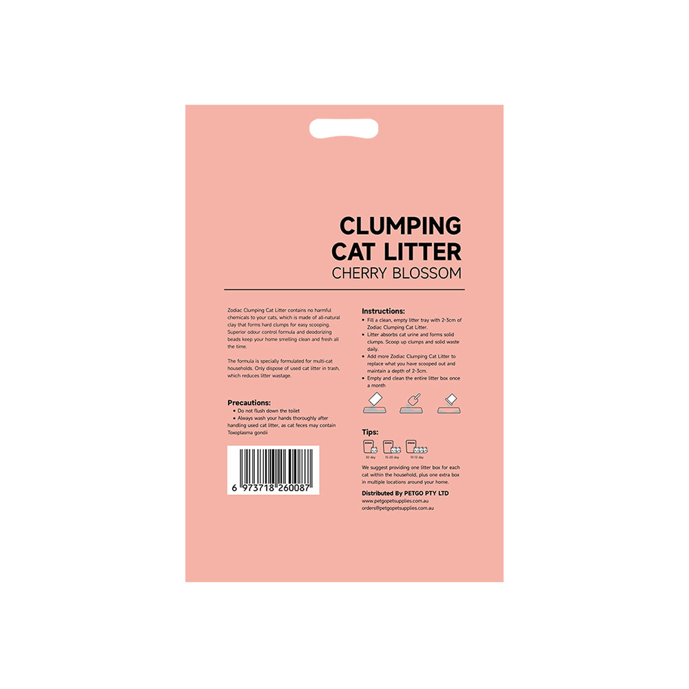 ZODIAC Cherry Blossom Clumping Cat Litter 6kg has a unique formula specially made for multi-cat households to help reduce odours and make clean-ups easier. The medium-grain particle size is perfect for clumping, trapping moisture, and preventing bad smells.